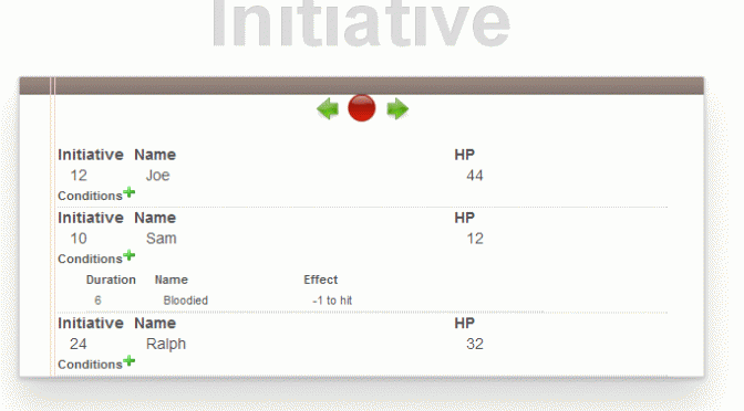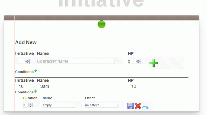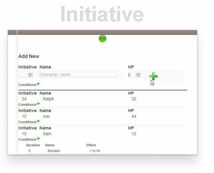 The application should allow the user to add characters as shown here. Enter initiative roll, name and hit points and click the plus sign.